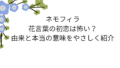 「ネモフィラ 植えてはいけない」と検索すると、庭に植えるのは危ないのか、本当に育てにくいのか、不安になる方も多いのではないでしょうか。澄んだ青い花が魅力のネモフィラですが、ネモフィラの特徴を知らないまま地植えすると、こぼれ種で増えすぎたり、...