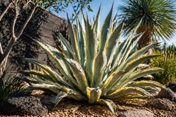 UC系の園芸資料では、斑入りのアメリカーナは一般種より小さめにまとまりやすく、約4フィート高、6フィート幅ほどの記載も見られます。もちろん育成環境によって変動はありますが、斑入りを選ぶ場合は、巨大化しにくい可能性がある一方で、成長の立ち上がりはやや穏やかになると見ておくと扱いやすいです。見た目の華やかさを優先するなら斑入り、迫力ある大型株を早めに楽しみたいなら基本種という考え方が合っています。
