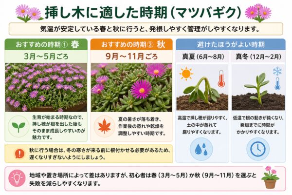 マツバギクの挿し木は、気温が安定している春と秋に行うと管理しやすくなります。目安となる時期は、春なら3月から5月ごろ、秋なら9月から11月ごろです。暑さや寒さが極端な時期を避けることで、切り取った茎への負担を減らし、発根までの状態を保ちやすくなります。