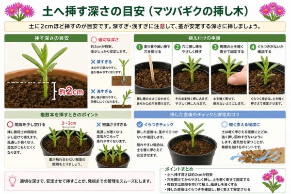 マツバギクの挿し穂は、土に2cmほど挿すのが目安です。深く挿しすぎると土の中で蒸れやすくなり、浅すぎると挿し穂が倒れやすくなります。茎が安定し、なおかつ過湿になりにくい深さを意識して挿します。