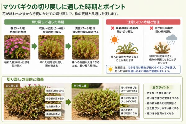 マツバギクの切り戻しは、花が終わった後から初夏にかけて行うと管理しやすくなります。この時期は生育の勢いが残っており、剪定後に新しい芽が動きやすいためです。春に枯れ枝を整理し、花後に全体の形を整える流れにすると、蒸れを防ぎながら株の更新を促せます。