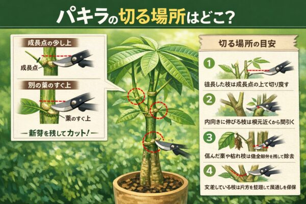 パキラの剪定で迷いやすいのが、どこにハサミを入れるかです。基本は、成長点や節を意識して切ることです。新芽が出やすい位置を残して切ると、剪定後の回復がスムーズになり、樹形も整えやすくなります。園芸情報では、別の葉や芽が出ている位置のすぐ上、または成長点の少し上で切る方法が紹介されています。