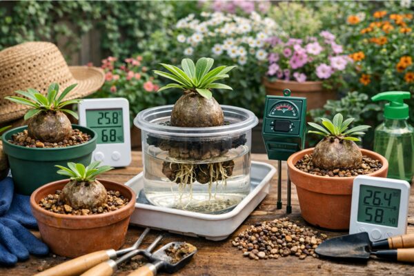発根管理で結果を左右しやすいのが温度です。パキプスは南西マダガスカルの乾燥地に自生する植物で、低温下で勢いよく動く性質ではありません。そのため、根がない状態の株を冷やすと、回復より消耗が先に進みやすくなります。 (出典:Plants of the World Online)