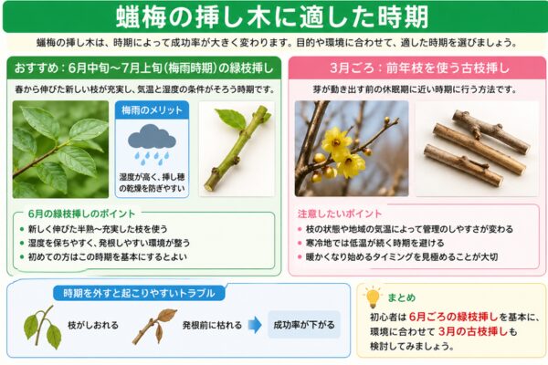 蝋梅は挿し木が簡単な樹木とは言い切れないため、時期を外すと枝がしおれたり、発根前に枯れたりする可能性が高まります。初めて挑戦する場合は、6月ごろの緑枝挿しを基本に考えるとよいでしょう。