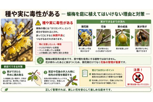 蝋梅は観賞用として楽しむ庭木であり、実や種を食用にする植物ではありません。種まきで増やす楽しみはありますが、扱い方を知らないまま庭に植えると、思わぬ不安材料になりやすいです。